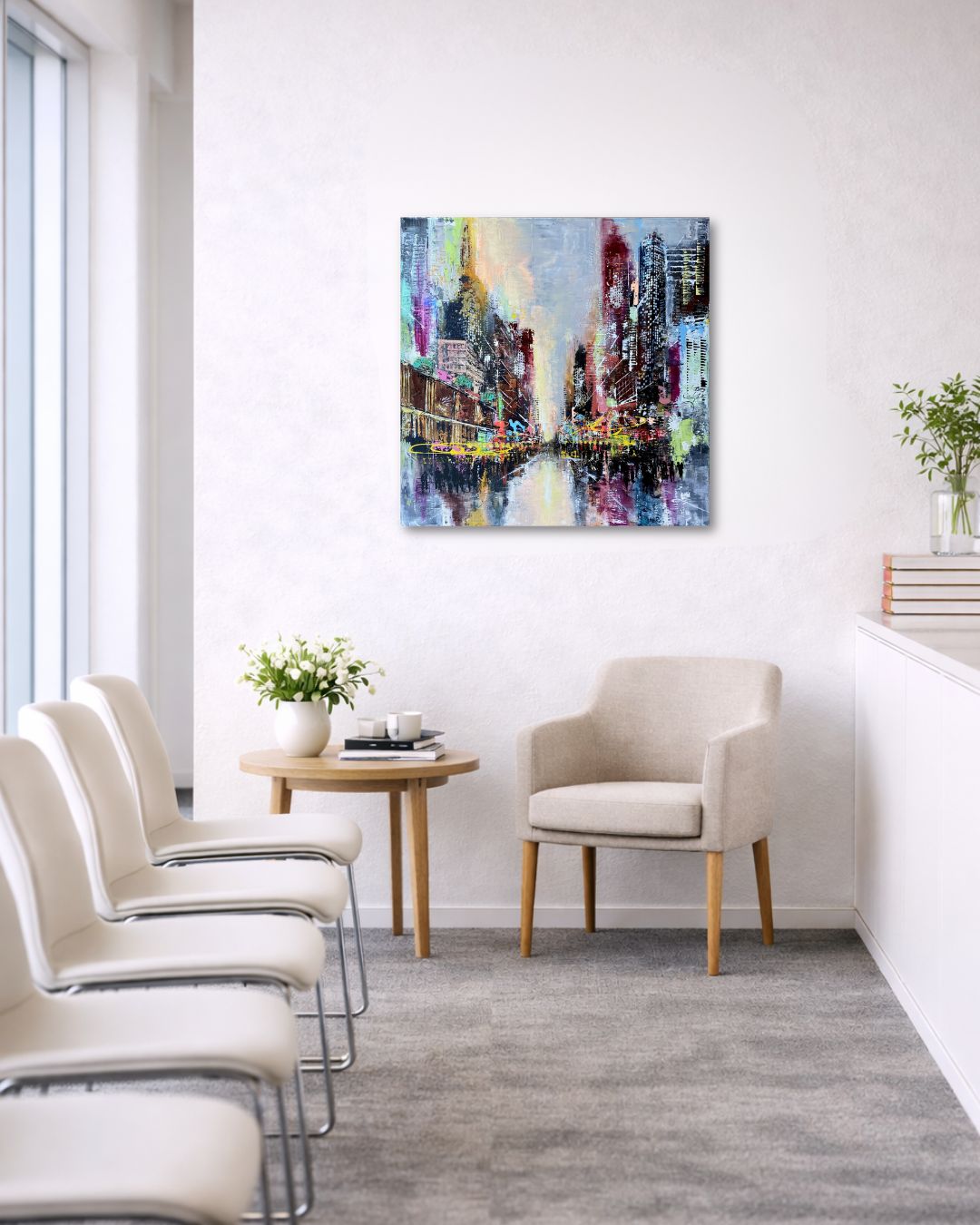 Wenn Interessenten möchten, kann ich ein Werk digital in ein Foto des Raumes einsetzen. So entsteht ein erster Eindruck davon, wie Größe, Farben und Perspektiven im Raum wirken.