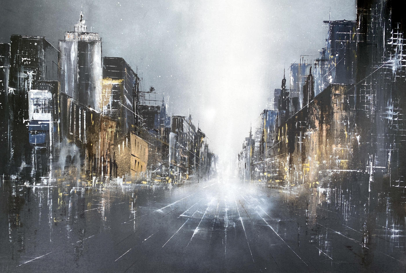 Das was kommt zeigt eine Stadtperspektive mit zentraler Achse und starkem Tiefenzug. Die architektonischen Strukturen führen in ein aufgehelltes Zentrum und gliedern den Raum präzise. Das Werk untersucht das Spannungsfeld zwischen Erwartung, Richtung und Bewegung.