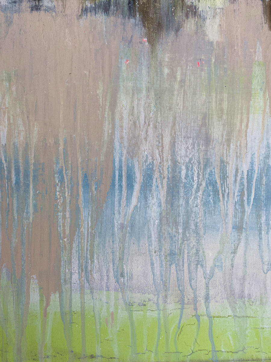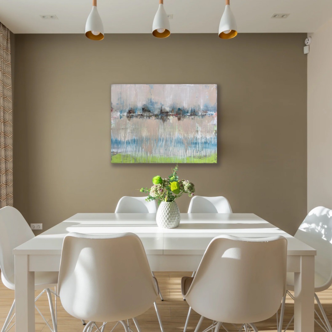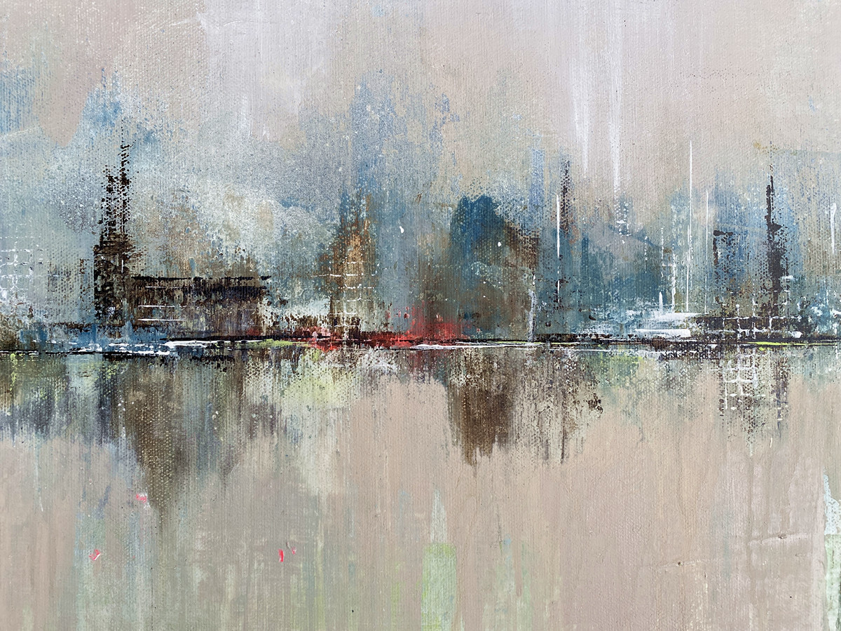 Frei fließend zeigt eine in Nebel getauchte, abstrahierte Hamburger Skyline, aus der sich Architekturformen nur schemenhaft herauslösen. Fließende Farbspuren und ausgewaschene Strukturen verweisen auf den Prozess des Entstehens – als würde sich die Stadt im Übergang zwischen Sichtbarkeit und Auflösung befinden.