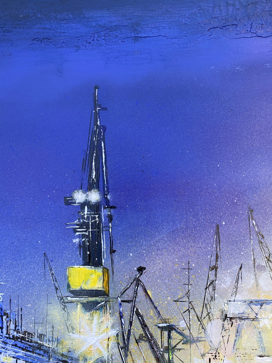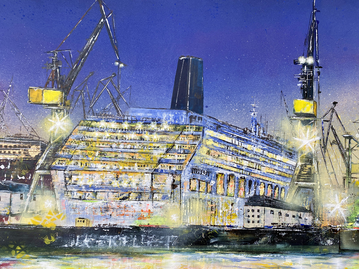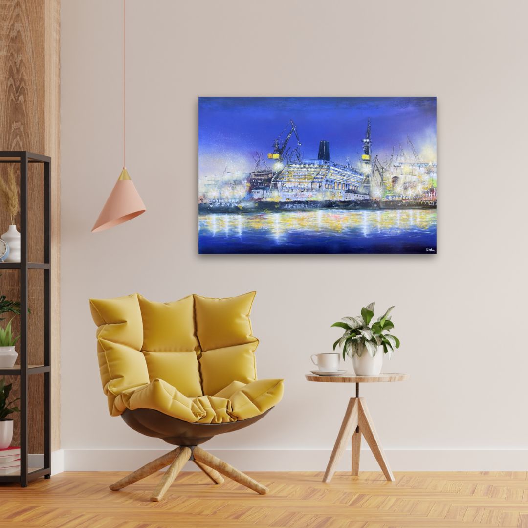 Klare Sicht zeigt ein Kreuzfahrtschiff im Trockendock einer Hamburger Werft, eingerahmt von aufragenden Hafenkränen. Zwischen industrieller Konstruktion und ruhiger Nachtatmosphäre entsteht eine klare, konzentrierte Bildstruktur, in der Technik, Maßstab und Licht eine präzise Spannung erzeugen.