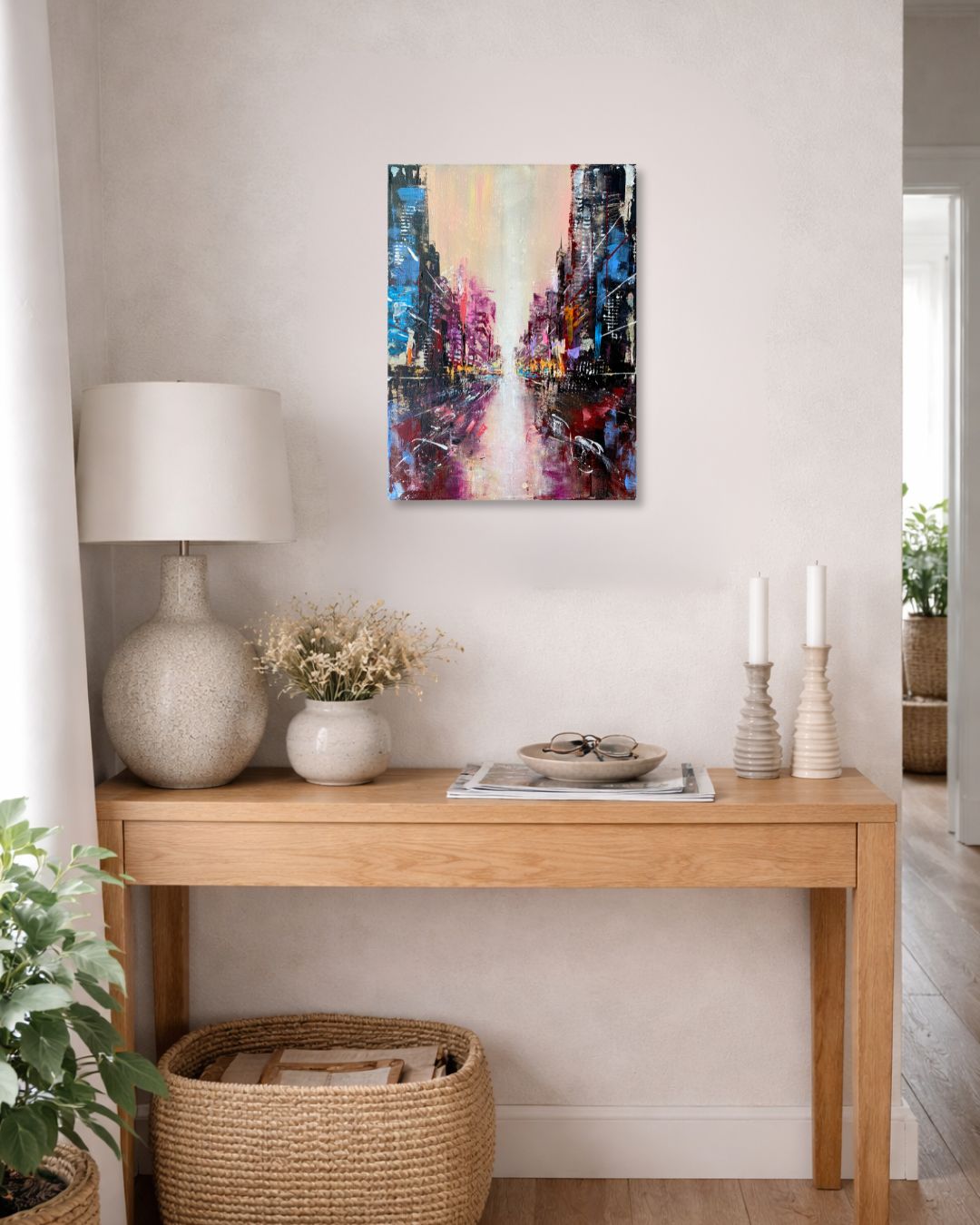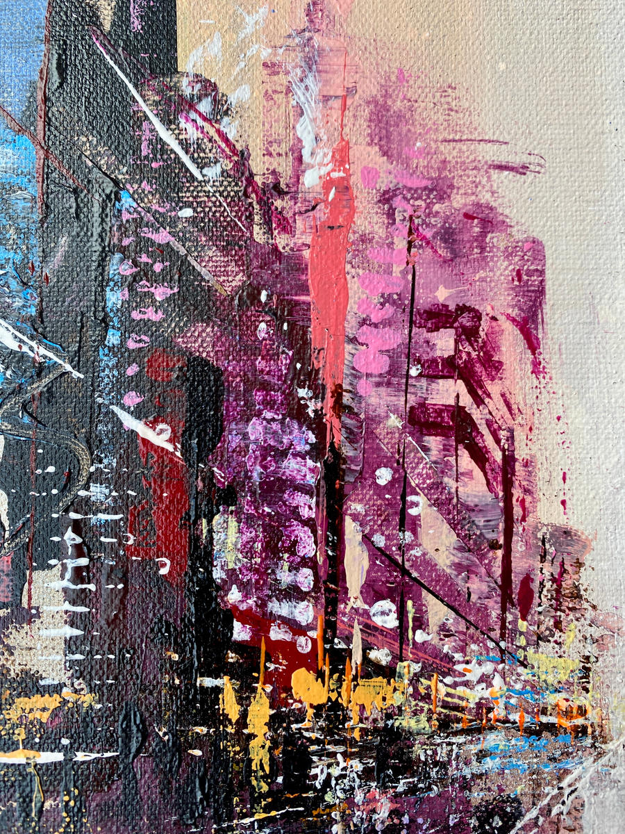 Urban Axis – First Light III entwickelt sich aus der Auseinandersetzung mit der vertikalen Architektur und der räumlichen Weite einer amerikanischen Metropole. Klare Fluchtlinien, aufsteigende Strukturen und überlagerte Farbfelder formen eine Komposition, die sich zwischen Dichte und Öffnung bewegt. Im Malprozess verbinden sich konstruktive Setzungen mit freien Eingriffen zu einer Balance zwischen Stabilität und Aufbruch.