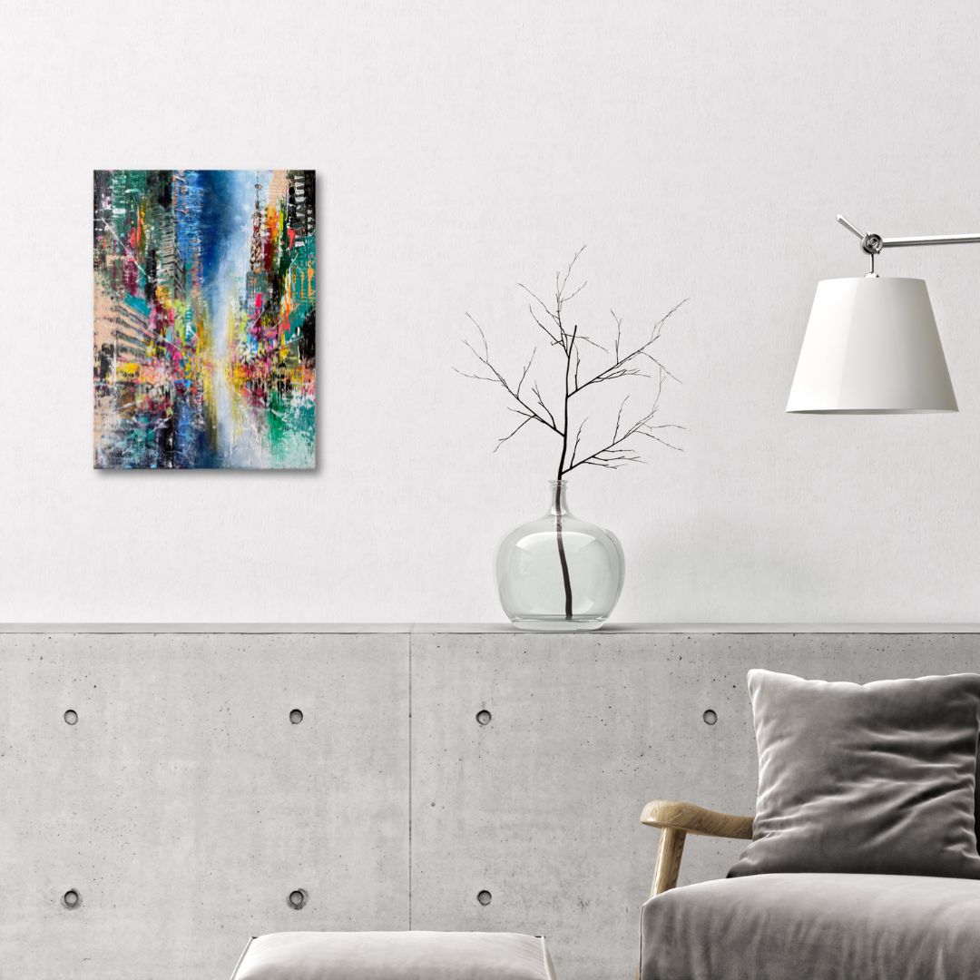 Urban Axis – Neon Constellation I entsteht aus der Auseinandersetzung mit nächtlicher urbaner Lichtdichte. Leuchtende Farbflächen, überlagerte Strukturen und klare Fluchtlinien verdichten sich zu einer vielschichtigen Stadtkomposition. Im Malprozess treffen konstruktive Achsen auf spontane Eingriffe, wodurch ein Spannungsfeld zwischen Ordnung und Bewegung entsteht. Inspiriert von Tokios Lichtern.