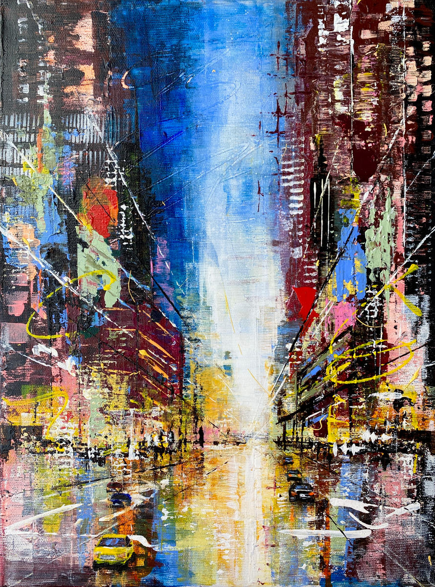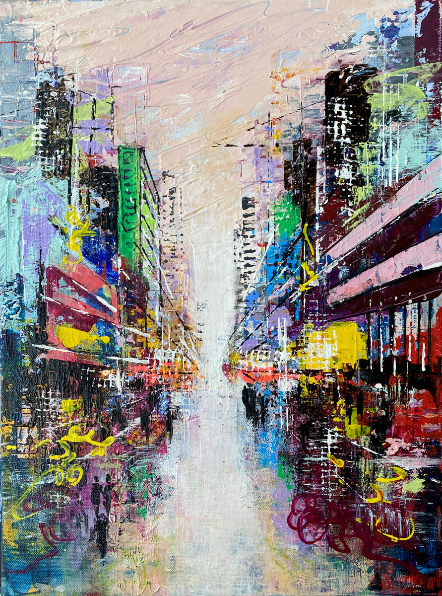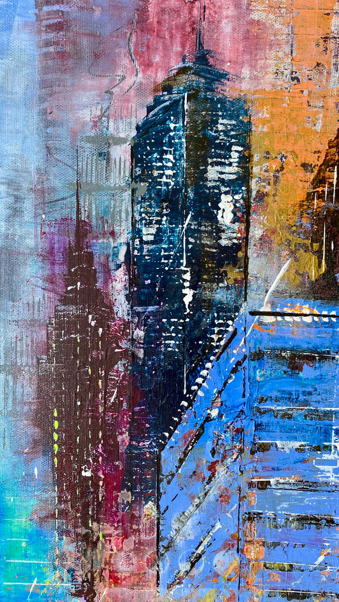 Urban Axis – The Space Between I untersucht den Zwischenraum innerhalb urbaner Strukturen. Architektonische Setzungen, lineare Verdichtungen und offene Flächen stehen einander gegenüber und entwickeln eine Komposition, die auf Übergängen und Verschiebungen basiert. Eine spielerische Figur im Raster der Stadt setzt einen individuellen Akzent innerhalb der konstruktiven Ordnung und erweitert den strukturellen Raum um eine persönliche Ebene. Der Malprozess bewegt sich zwischen präziser Anlage und bewusst gesetzten Brüchen.